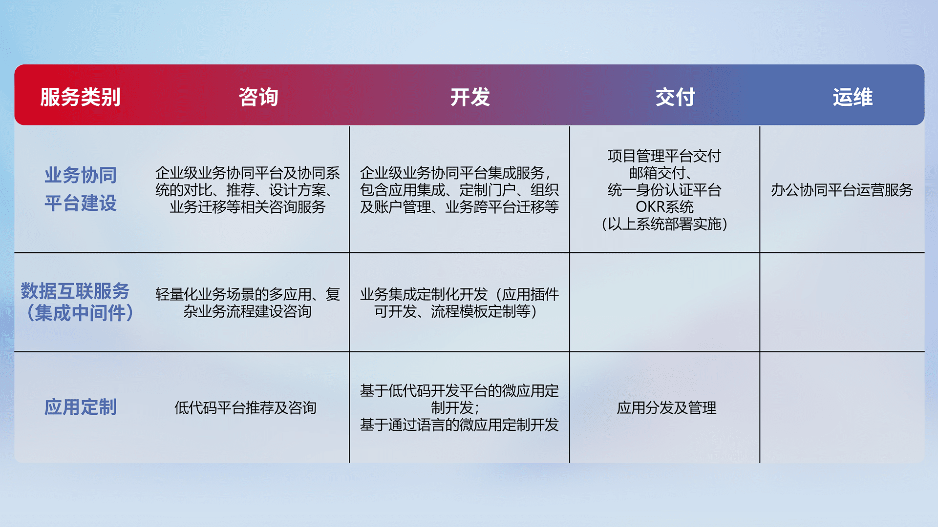 针对钉钉、、、、企微、、IDaas等平台级产品提供产品的规划、、方案、、交付、、定制化开发等服务,,实现如统一协同办公、、智能客户服务、、混合会议管理、、、智能数据查询、、等业务场景,,,,实现数字化转型。。。